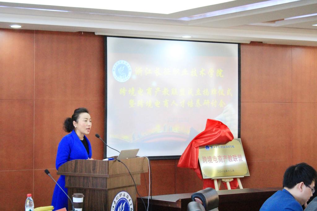 会议审议并一致通过了《浙江长征职业技术学院跨境电商产教联盟章程》及理事长、副理事长、秘书长提名人选议案。在大家的翘首企盼中,杭州跨境电商综合试验区外联宣传部部长武长虹女士和学院党委书记、常务副院为跨境电商产教联盟成立揭牌。随后,学院副院长致辞,他充分肯定了产教联盟成立的意义,并对联盟工作提出了希望,“跨境电商产教联盟的成立是推动教学与产业发展的重要手段,是做好做强产业与教学的客观需求,是进行人才培养与输送推动跨境电商发展的有效平台。要服务产业转型升级,深化产教融合;加强校企紧密合作,实现人才共育;强化联盟工作平台,打造职教品牌。”