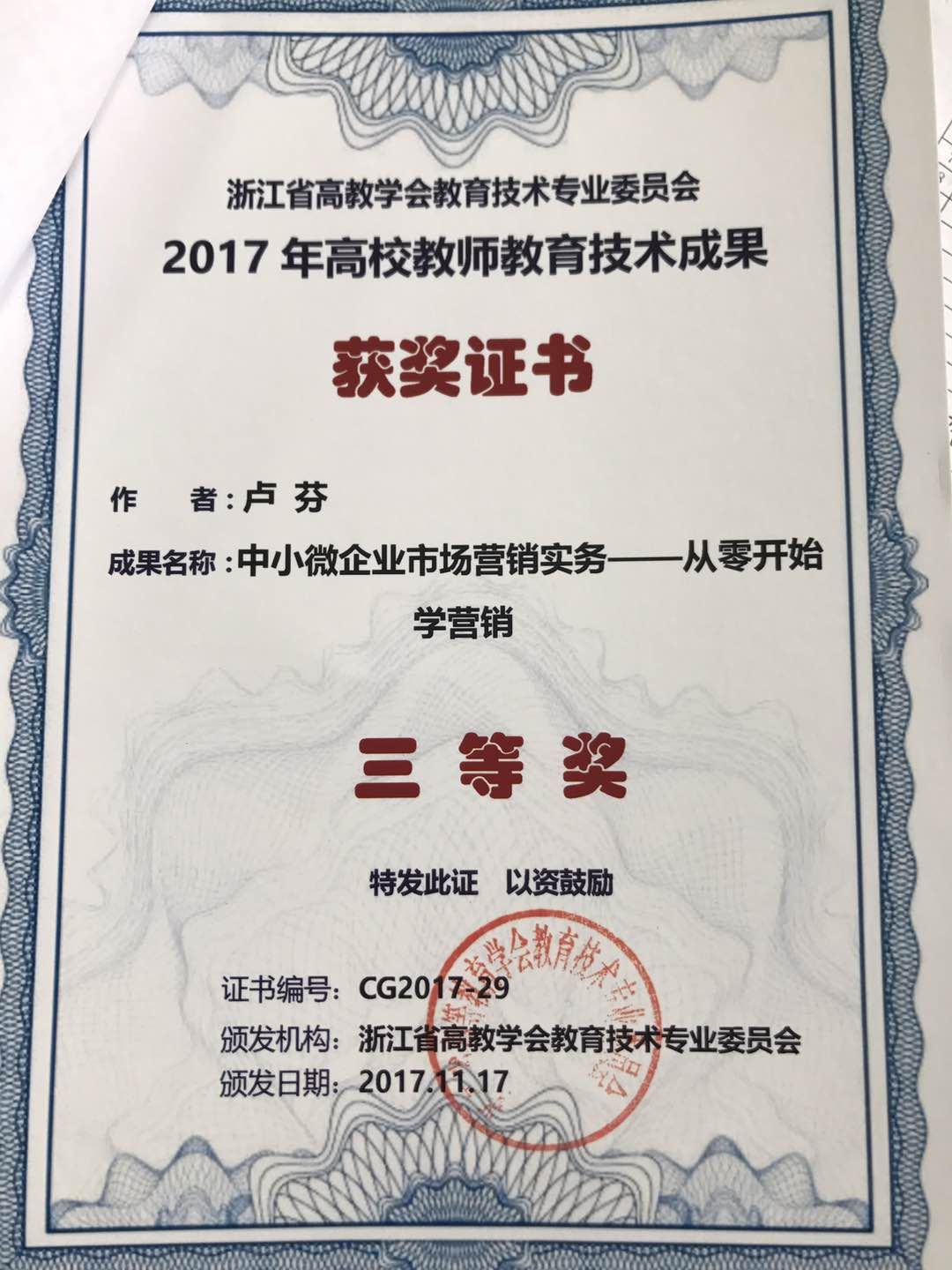 11月,在2017年浙江省高校教师教育技术成果评比活动中,商务系卢芬老师主持的 《中小微企业市场营销实务——从零开始学营销》课程荣获三等奖。该课程在浙江省高等学校精品在线开放课程共享平台上(http://zjedu.moocollege.com/)开课。