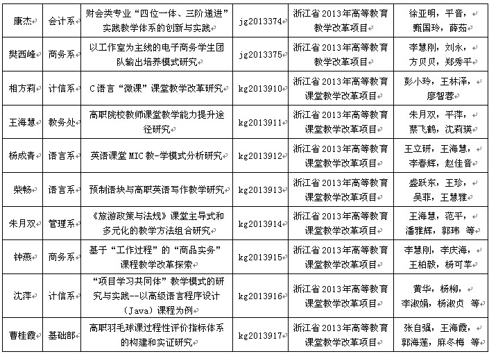 根据浙教办高教【2013】109号文件, 我院康杰、樊西峰主持的教改项目获高等教育教学改革项目立项,相方莉、王海慧、杨成青、柴畅、朱月双、钟燕、沈萍、曹桂霞等教师主持的教改项目获高等教育课堂教学改革项目立项。