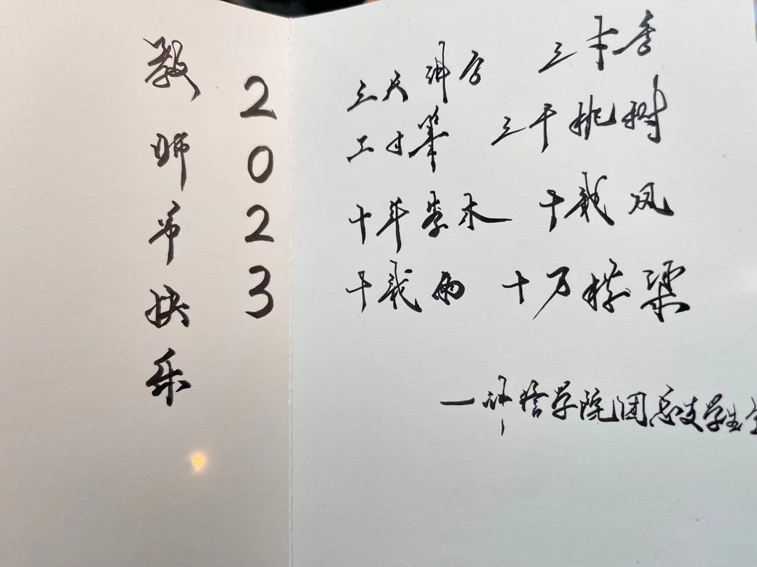 9月8日,各二级学院学生自发组织起来,用不同的方式向老师们表达感恩和祝福。有的同学为老师们送上鲜花,让芬芳萦绕整个教室;有的同学在上课前,集体起立,用简单、质朴、真挚的话语向老师道出无尽的尊敬与感谢;有的同学通过贺卡、QQ、微信等方式向老师送出祝福,字里行间流露出同学们对老师传道授业的深深感激与浓浓依恋……