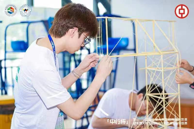 本次竞赛吸引了全省近48所高校100支代表队的300余名学生参赛。比赛以“悬挑观景平台结构设计与模型制作”为选题,要求学生设计、制作一个悬挑观景平台结构模型,并测试其模拟承受风载及移动人群重力作用下的平台结构的安全可靠性,共有包括理论方案设计、9小时模型现场制作、模型结构陈述与专家提问答辩和模型加载测试五个环节,主要考察选手的专业理论知识、创造创新能力和实际动手能力。