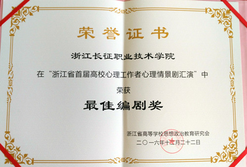 2016年12月22日下午在浙江大学紫金港剧场举行了“浙江省高校心理咨询工作联盟成立大会暨浙江省首届高校心理工作者心理情景剧汇演”活动,我院基础部心理教师姬磊、思政教师侯培玲两位老师代表我院参加了小和山片区心理情景剧《一个高校心理咨询师的周五日常》的表演,该情景剧笑中带泪,感染了台下观众,获得同行的一致好评,荣获最佳编剧奖。