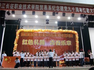 为纪念建党九十周年,弘扬我党优良传统,加强青年学生爱党爱国教育,4月28日晚上6点半,贸易系举办了以“红色礼赞、青春乐章” 为主题纪念建党九十周年红歌大赛,学院副院长杜宝山教授、副院长贺旭辉教授、副院长王其军教授、系主任罗明教授、院团委书记陶元老师、系党总支副书记杨现华老师及2010级700余名学生参加了此次活动。