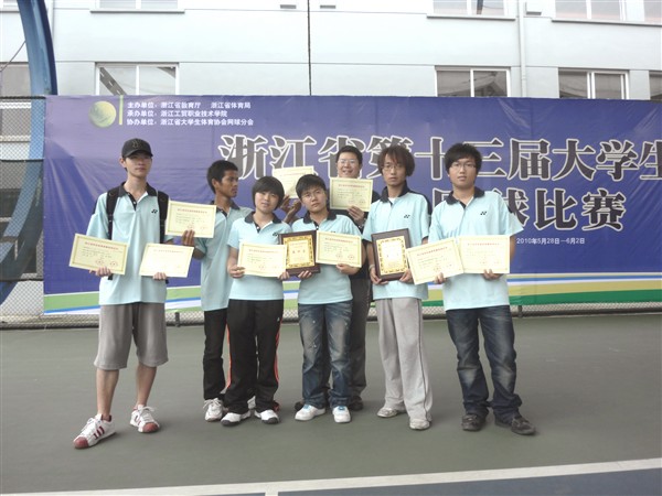2010年5月28日至6月2日,由浙江省教育厅、浙江省体育局主办的“浙江省第十三届大学生运动会网球比赛”落下帷幕。我院在本次比赛中,由教练员张自强老师率领的学院网球队(队员:杨希、章慧婷、张旭、林浩、杨栋、苏秦刚)不畏强手,奋勇拼搏,经过为期6天的鏖战,获得了骄人的成绩: